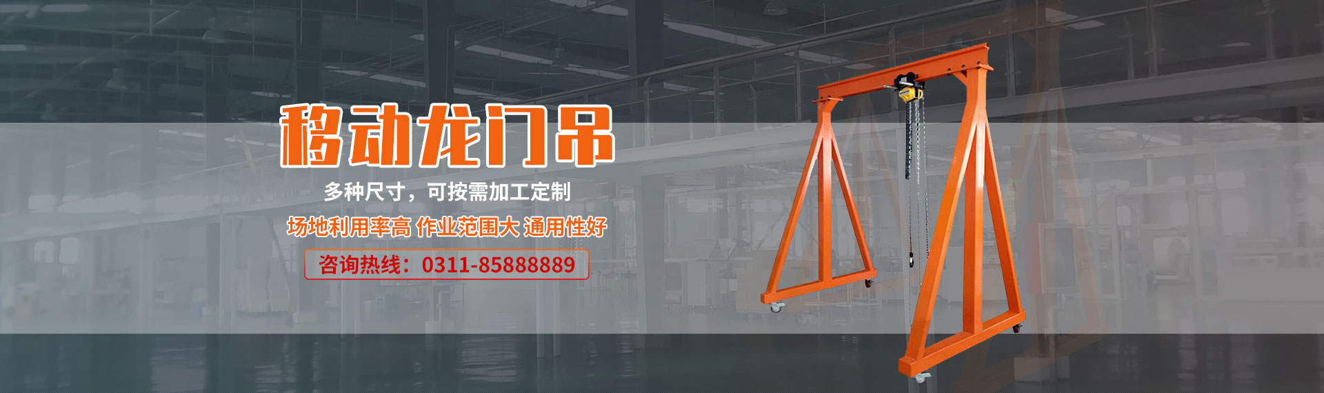 成華牌龍門(mén)吊架在工業(yè)生產(chǎn)車(chē)間更具靈活機(jī)動(dòng)、適應(yīng)性廣等特點(diǎn),在工業(yè)裝備的搬運(yùn)挪移中是高效自動(dòng)生產(chǎn)線上必備的單獨(dú)應(yīng)急吊裝設(shè)備,有了它能確保生產(chǎn)線暢通無(wú)阻。